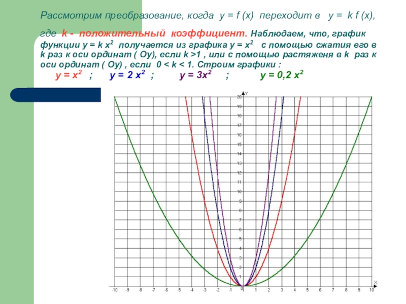 = k f (x), где k - положительный коэффициент. Наблюдаем, что, график функции у = k х2 получается из графика у = х2 с помощью сжатия его в k раз к оси ординат ( Оу), если k >1 , или с помощью растяженя в k раз к оси ординат ( Оу) , если 0 < k < 1. Строим графики :