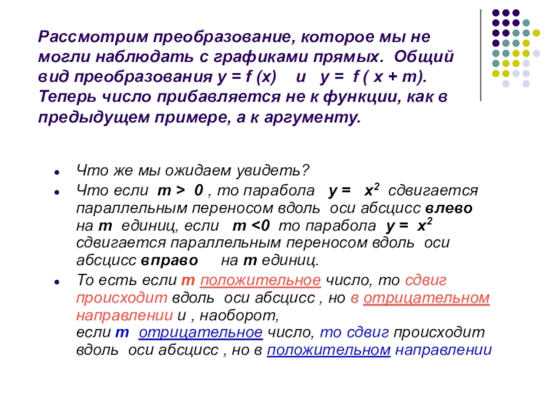 Что если m > 0 , то парабола y = x2 сдвигается параллельным переносом вдоль оси абсцисс влево на m единиц, если m <0 то парабола y = x2 сдвигается параллельным переносом вдоль оси абсцисс вправо на m единиц.