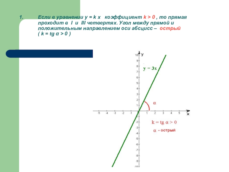 0 , то прямая проходит в I и III четвертях. Угол между прямой и положительным направлением оси абсцисс – острый