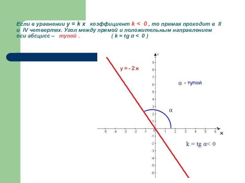 0 , то прямая проходит в II и IV четвертях. Угол между прямой и положительным направлением оси абсцисс – тупой . ( k = tg α < 0 )