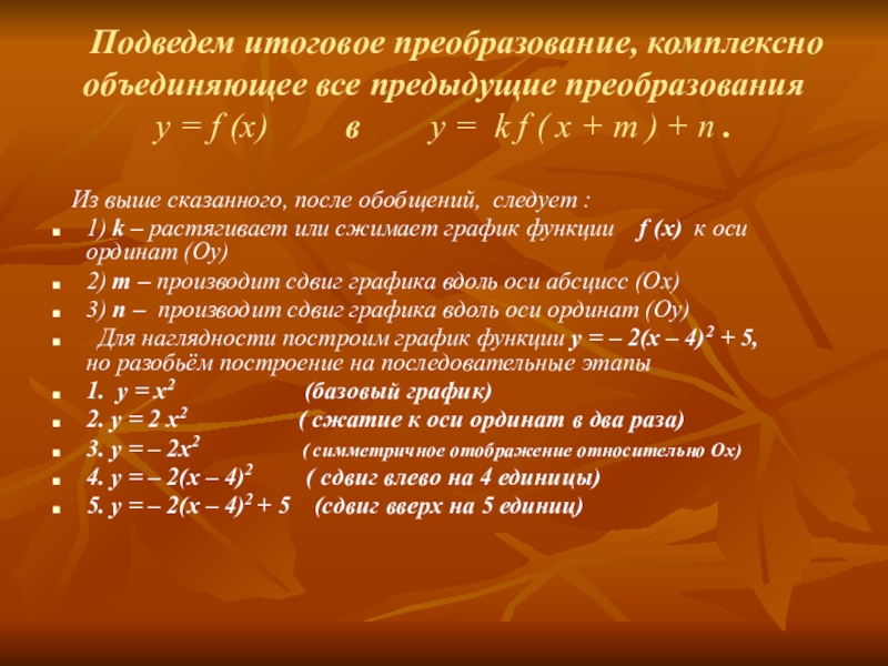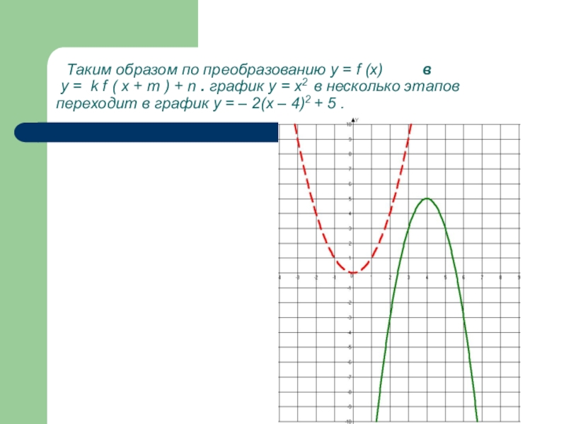 у = k f ( x + m ) + n . график у = х2 в несколько этапов переходит в график у = – 2(х – 4)2 + 5 .
