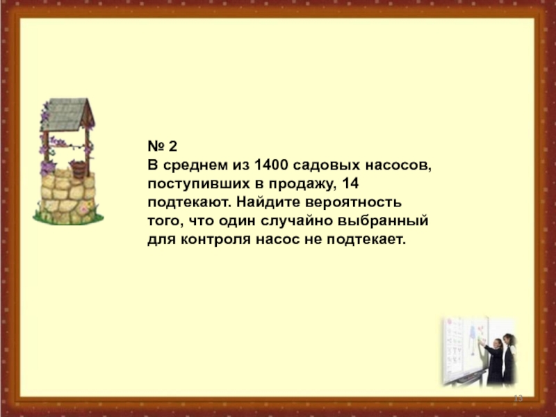 2.В среднем из 1300 садовых насосов, поступивших в продажу, 13 подтекают. Найдите вероятность того, что один случайно выбранный для контроля насос не подтекает.