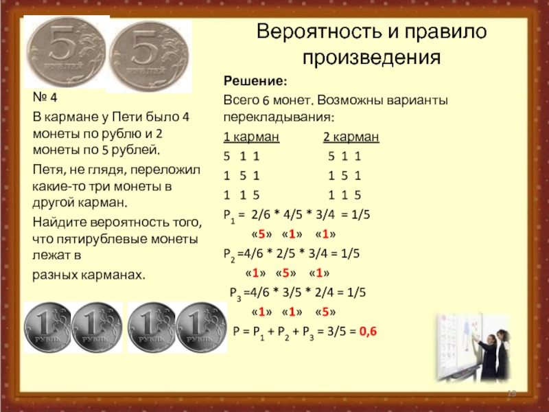 Вероятность и правило произведения Решение:Всего 6 монет. Возможны варианты перекладывания:1 карман