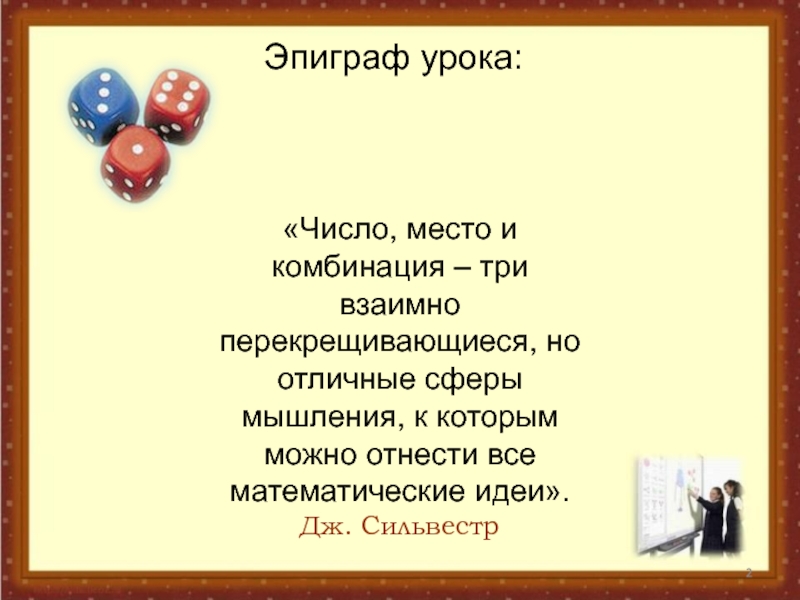 Эпиграф урока: «Число, место и комбинация – три взаимно перекрещивающиеся, но отличные сферы мышления, к которым можно отнести все математические идеи».Дж. Сильвестр