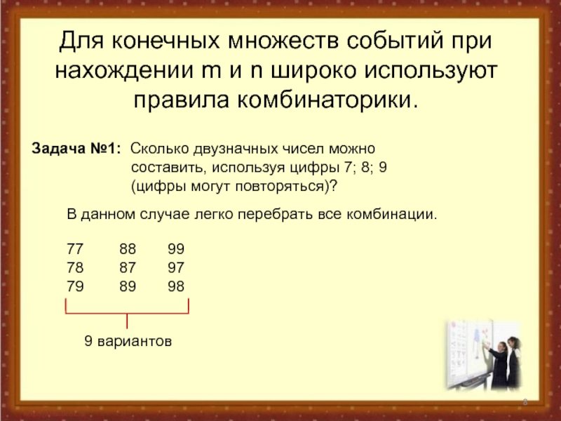 Для конечных множеств событий при нахождении m и n широко используют правила комбинаторики. Задача №1: Сколько двузначных