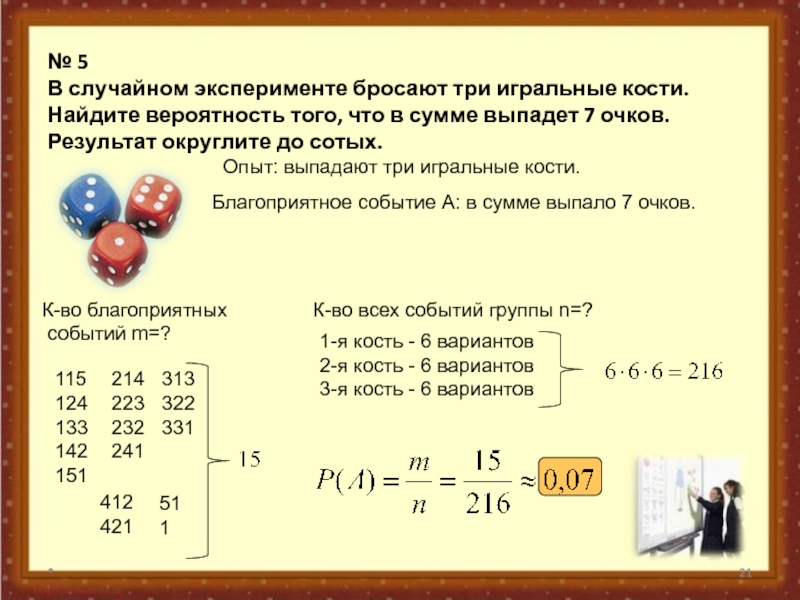 Слайд 20№ 5 В случайном эксперименте бросают три игральные кости. Найдите вероятность того,