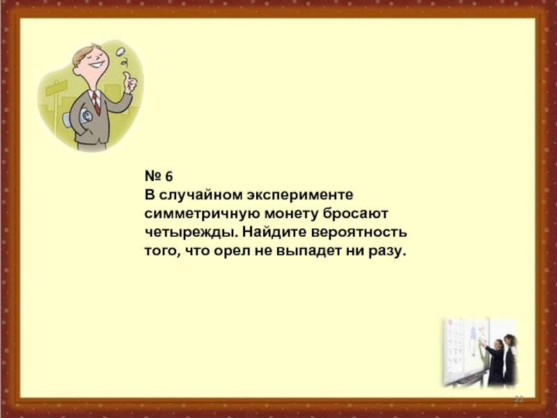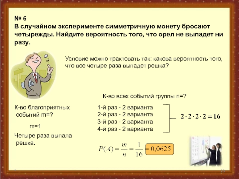 Слайд 22№ 6 В случайном эксперименте симметричную монету бросают четырежды. Найдите вероятность того,