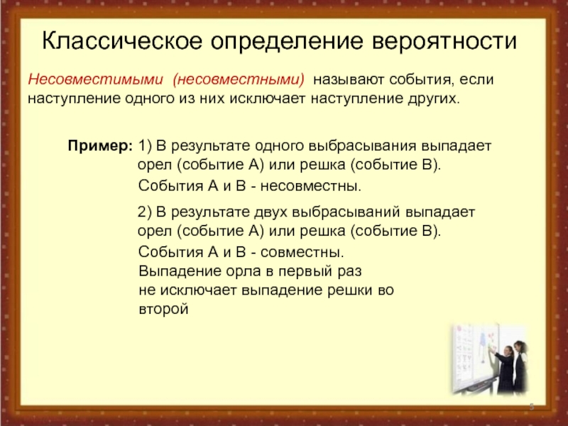 Классическое определение вероятностиНесовместимыми (несовместными) называют события, если наступление одного из них исключает наступление других. Пример: 1) В