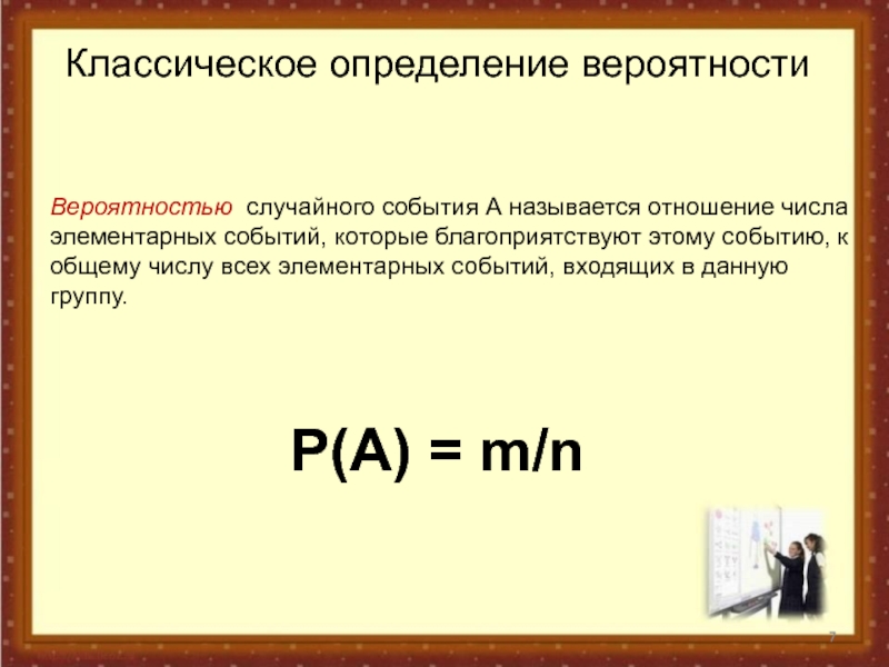 Слайд 7Вероятностью случайного события А называется отношение числа элементарных событий, которые благоприятствуют