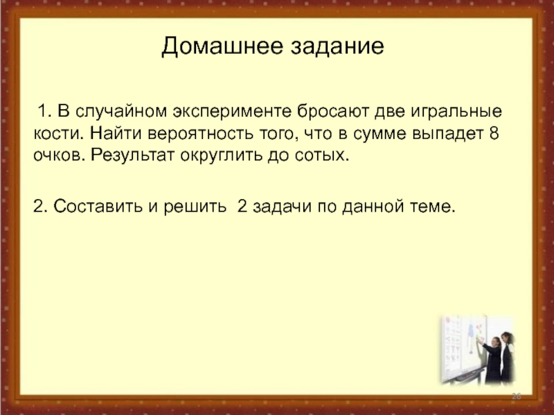 Домашнее задание  1. В случайном эксперименте бросают две игральные кости. Найти вероятность того, что в