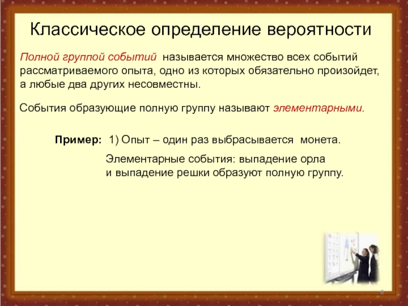 Классическое определение вероятностиПолной группой событий называется множество всех событий рассматриваемого опыта, одно из которых обязательно произойдет, а