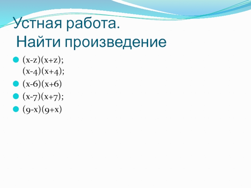 Устная работа.   Найти произведение (х-z)(х+z); (х-4)(х+4); (х-6)(х+6)(х-7)(х+7); (9-х)(9+х)