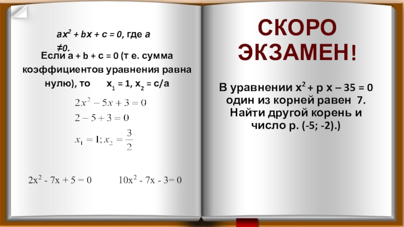 Если а + b + с = 0 (т е. сумма коэффициентов уравнения равна нулю), то х1 = 1, х2 = с/а