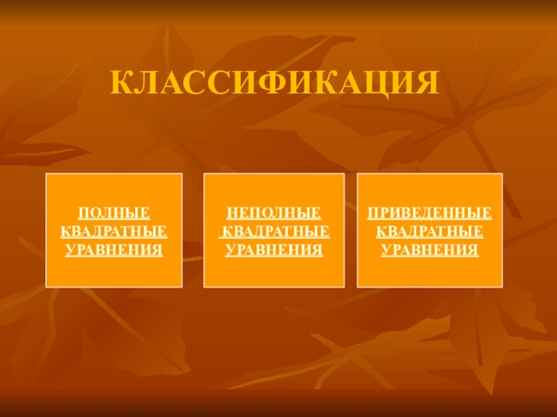 КЛАССИФИКАЦИЯПОЛНЫЕКВАДРАТНЫЕУРАВНЕНИЯНЕПОЛНЫЕ КВАДРАТНЫЕ УРАВНЕНИЯПРИВЕДЕННЫЕКВАДРАТНЫЕ УРАВНЕНИЯ