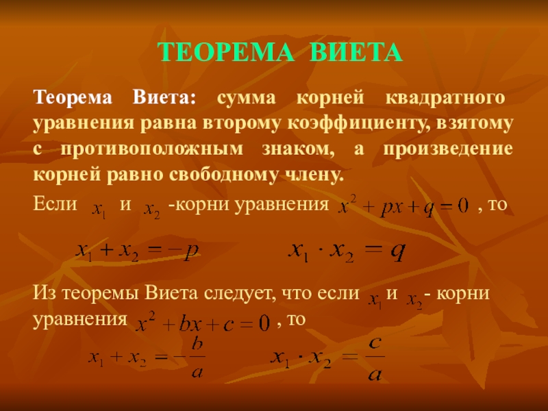 ТЕОРЕМА ВИЕТАТеорема Виета: сумма корней квадратного уравнения равна второму коэффициенту, взятому с противоположным знаком, а произведение корней