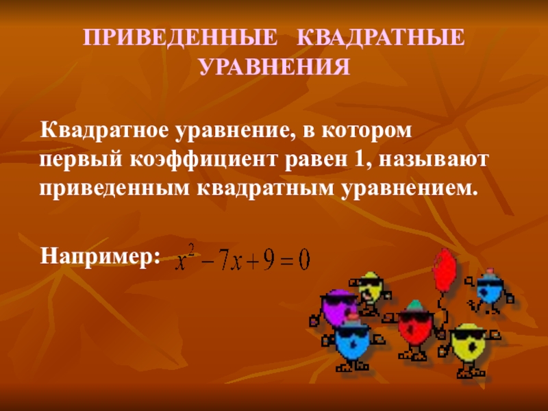 Слайд 5ПРИВЕДЕННЫЕ КВАДРАТНЫЕ УРАВНЕНИЯ