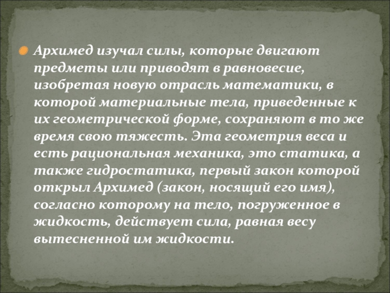 новую отрасль математики, в которой материальные тела, приведенные к их геометрической форме, сохраняют в то же время свою тяжесть. Эта геометрия веса и есть рациональная механика, это статика, а также гидростатика, первый закон которой открыл Архимед (закон, носящий его имя), согласно которому на тело, погруженное в жидкость, действует сила, равная весу вытесненной им жидкости.