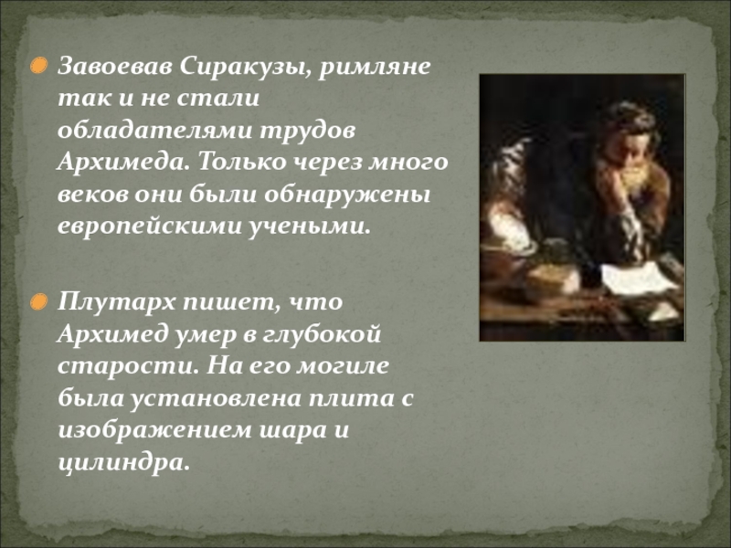 Слайд 10Завоевав Сиракузы, римляне так и не стали обладателями трудов Архимеда. Только