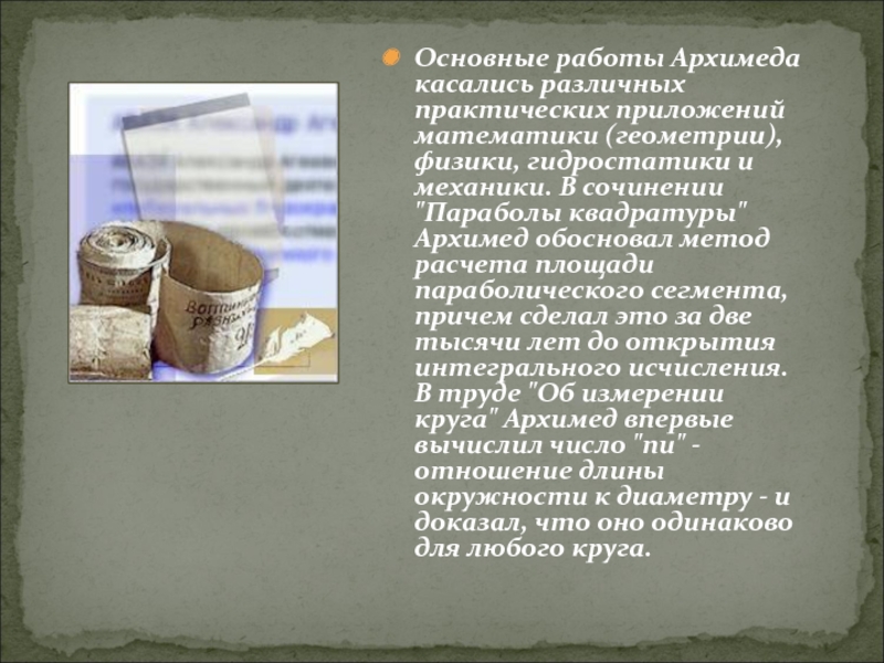 Слайд 4Основные работы Архимеда касались различных практических приложений математики (геометрии), физики, гидростатики