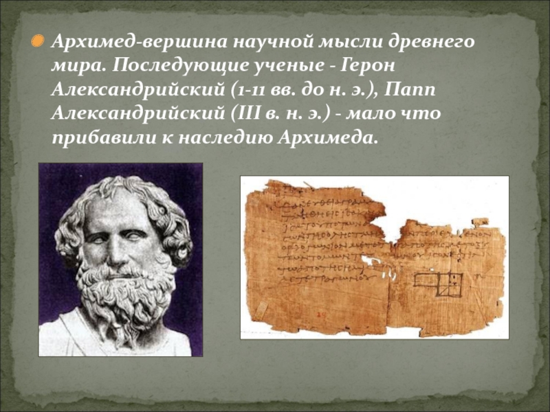 Слайд 2Архимед-вершина научной мысли древнего мира. Последующие ученые - Герон Александрийский (1-11