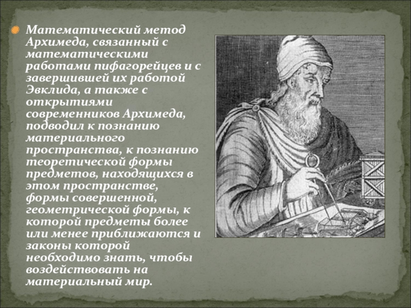 Слайд 5Математический метод Архимеда, связанный с математическими работами пифагорейцев и с завершившей