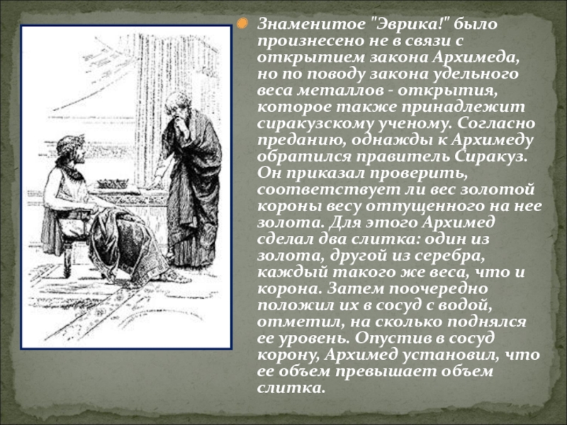 Слайд 7Знаменитое "Эврика!" было произнесено не в связи с открытием закона Архимеда,