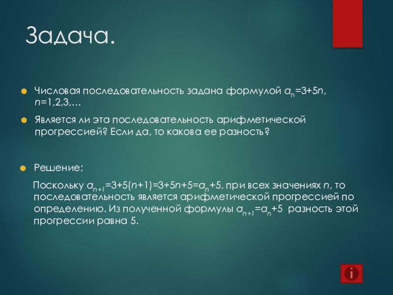 Поскольку an+1=3+5(n+1)=3+5n+5=an+5, при всех значениях n, то последовательность является арифметической прогрессией по определению. Из полученной формулы an+1=an+5 разность этой прогрессии равна 5.