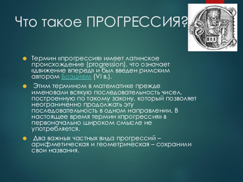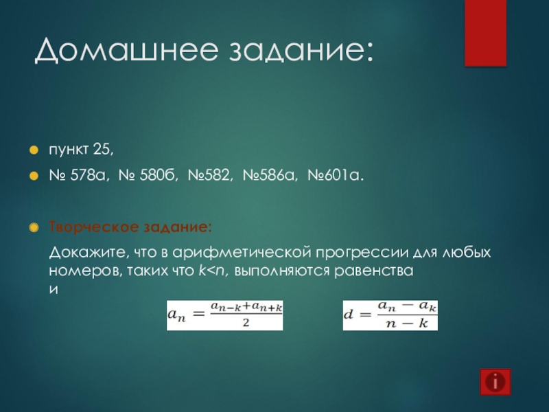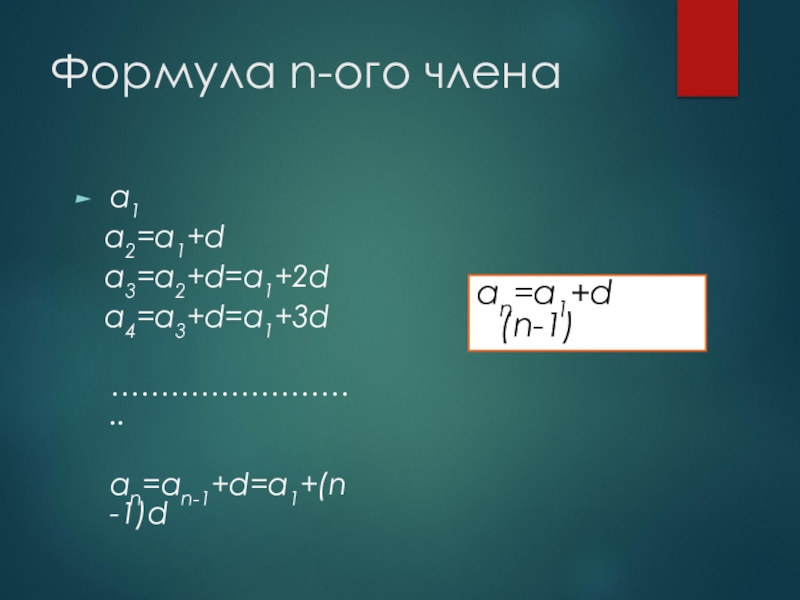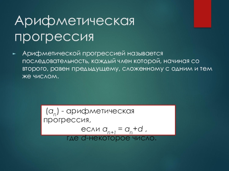 Число d, показывающее, на сколько следующий член последовательности отличается от предыдущего, называется разностью прогрессии.