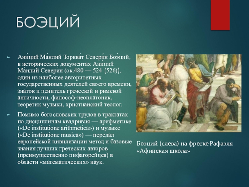 Боэций (слева) на фреске Рафаэля «Афинская школа»