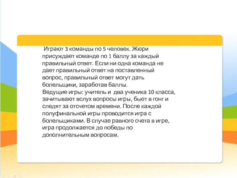 Слайд 3 Играют 3 команды по 5 человек. Жюри присуждает команде по