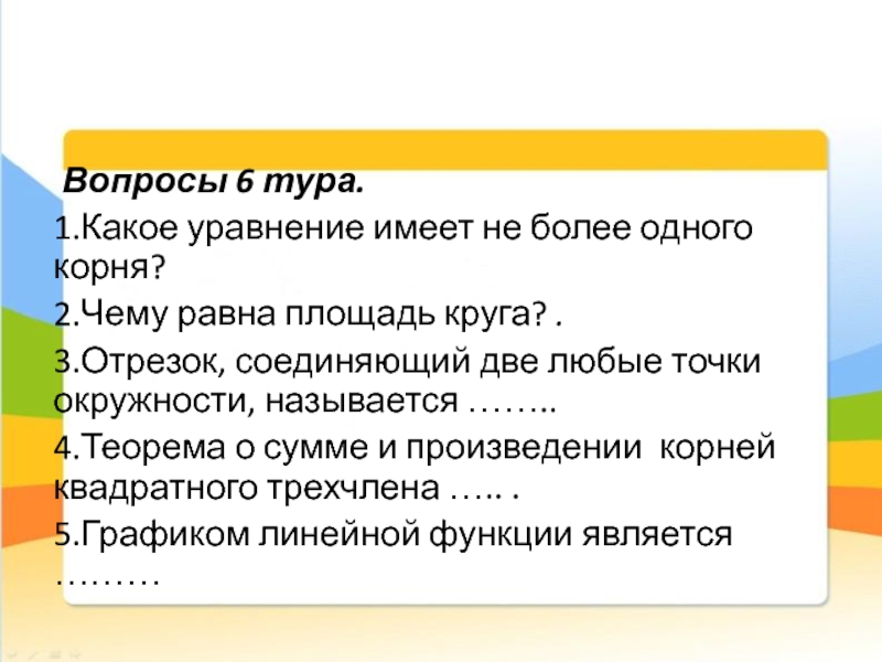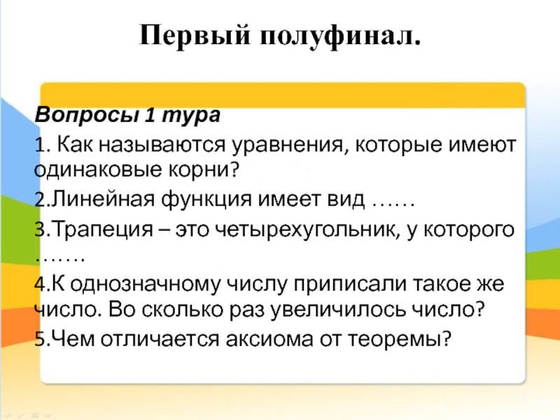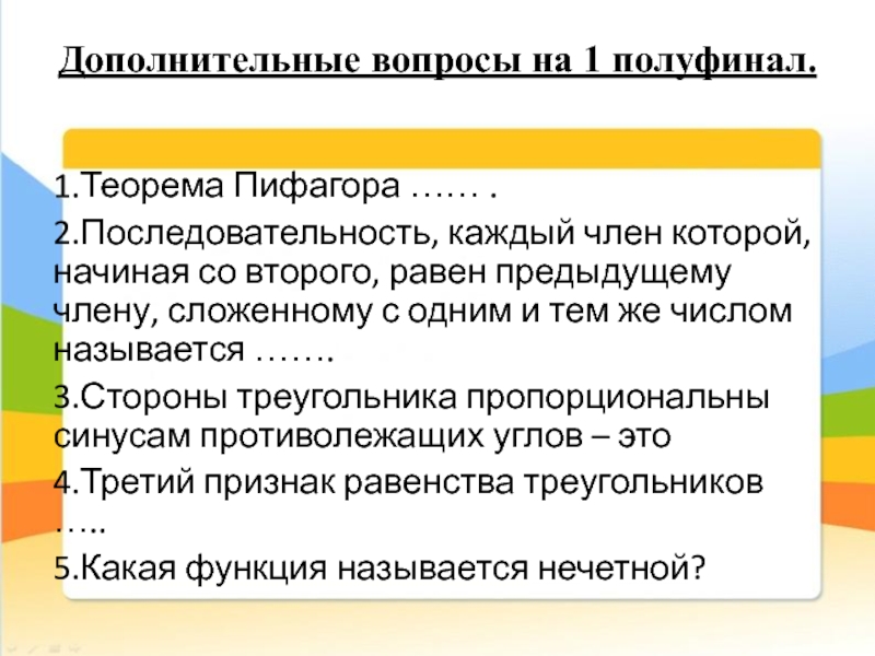 Слайд 6Дополнительные вопросы на 1 полуфинал.