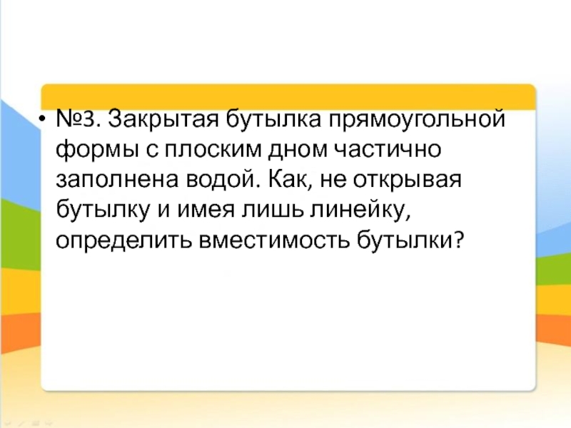 Слайд 14№3. Закрытая бутылка прямоугольной формы с плоским дном частично заполнена водой.