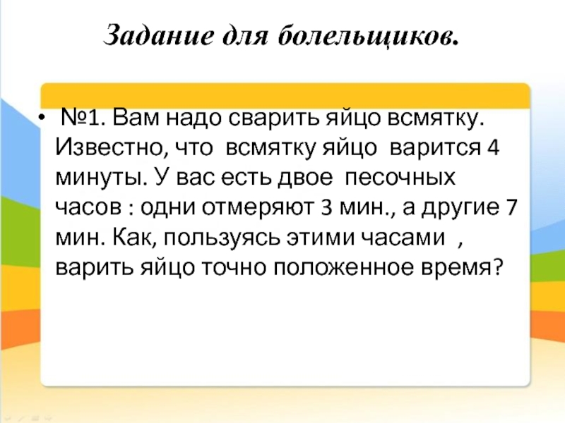 №1. Вам надо сварить яйцо всмятку. Известно, что