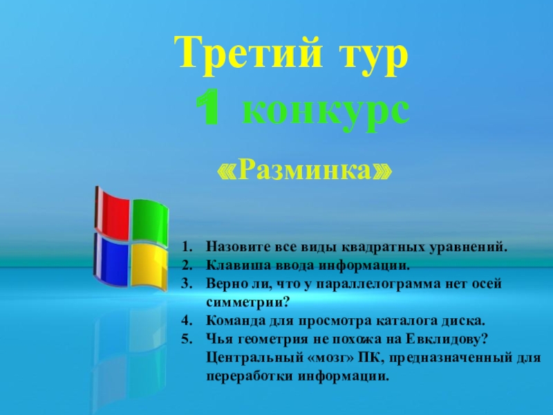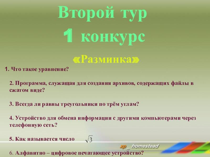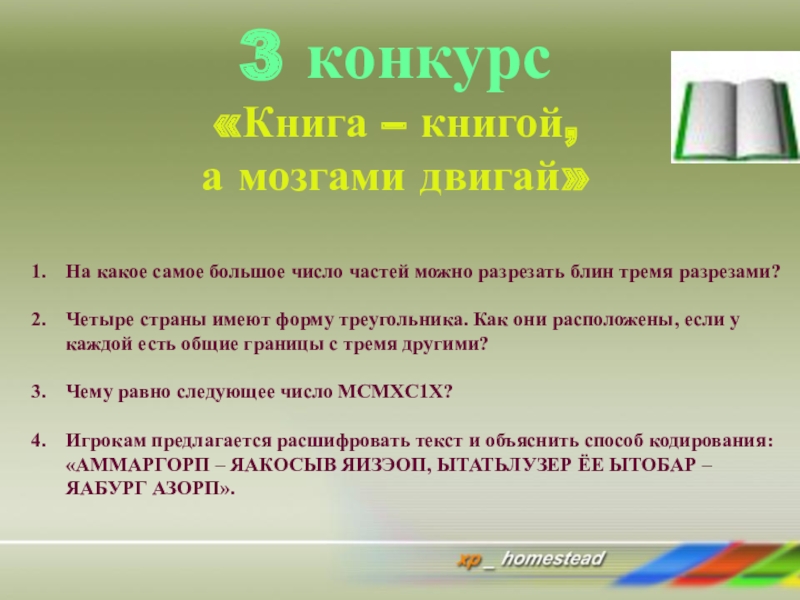 Игрокам предлагается расшифровать текст и объяснить способ кодирования: «АММАРГОРП – ЯАКОСЫВ ЯИЗЭОП, ЫТАТЬЛУЗЕР ЁЕ ЫТОБАР – ЯАБУРГ АЗОРП».
