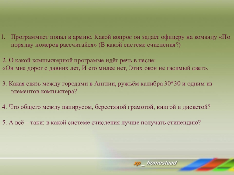 Программист попал в армию. Какой вопрос он задаёт офицеру на команду «По порядку номеров рассчитайся» (В какой системе счисления?)