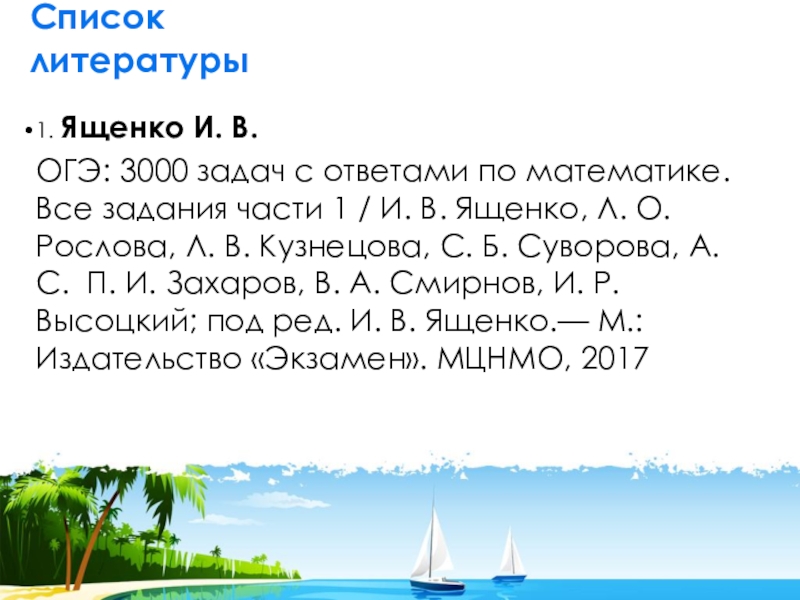 Список литературы 1. Ященко И. В.ОГЭ: 3000 задач с ответами по математике. Все задания части 1 / И. В. Ященко, Л. О. Рослова, Л. В. Кузнецова, С. Б. Суворова, А. С. П. И. Захаров, В. А.