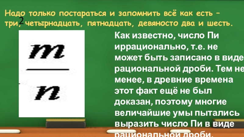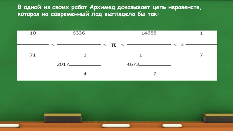Как известно, число Пи иррационально, т.е. не может быть записано в виде рациональной дроби. Тем не менее, в древние времена этот факт ещё не был доказан, поэтому многие величайшие умы пытались выразить число Пи в виде рациональной дроби.