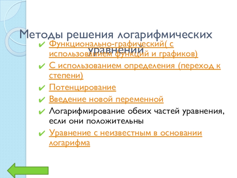 Методы решения логарифмических уравненийФункционально-графический( с использованием функций и графиков)С использованием определения (переход к степени)ПотенцированиеВведение новой