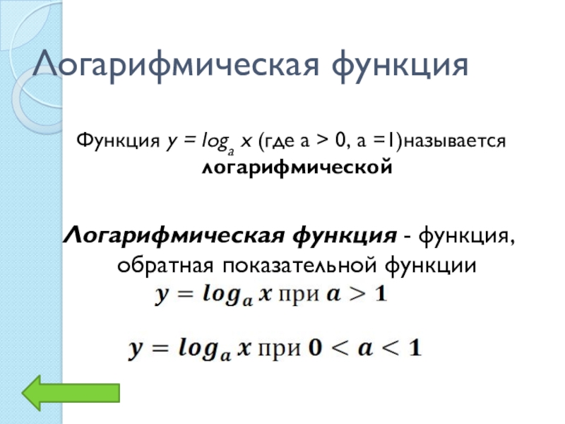 Логарифмическая функция Функция y = loga x (где а > 0, а =1)называется     логарифмическойЛогарифмическая функция -