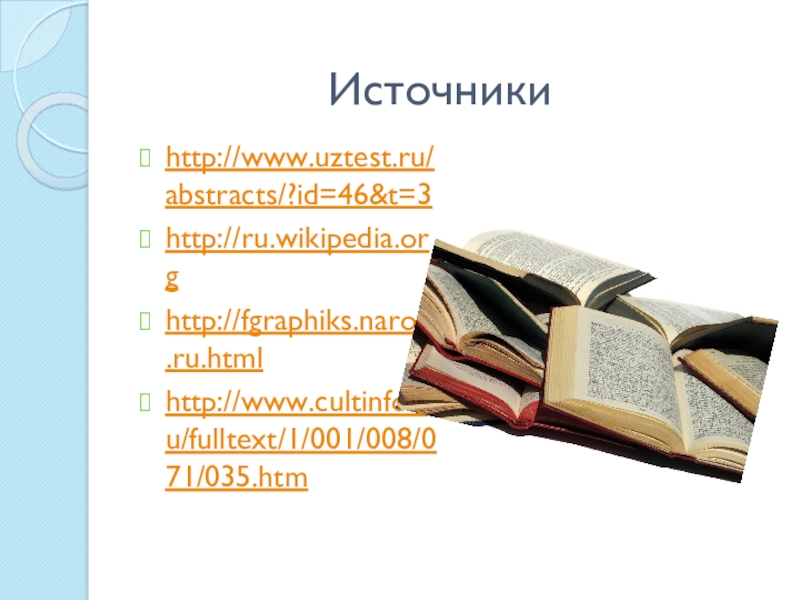 Источникиhttp://www.uztest.ru/abstracts/?id=46&t=3http://ru.wikipedia.orghttp://fgraphiks.narod.ru.htmlhttp://www.cultinfo.ru/fulltext/1/001/008/071/035.htm