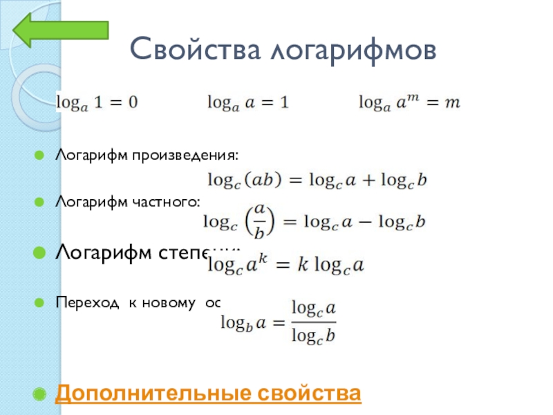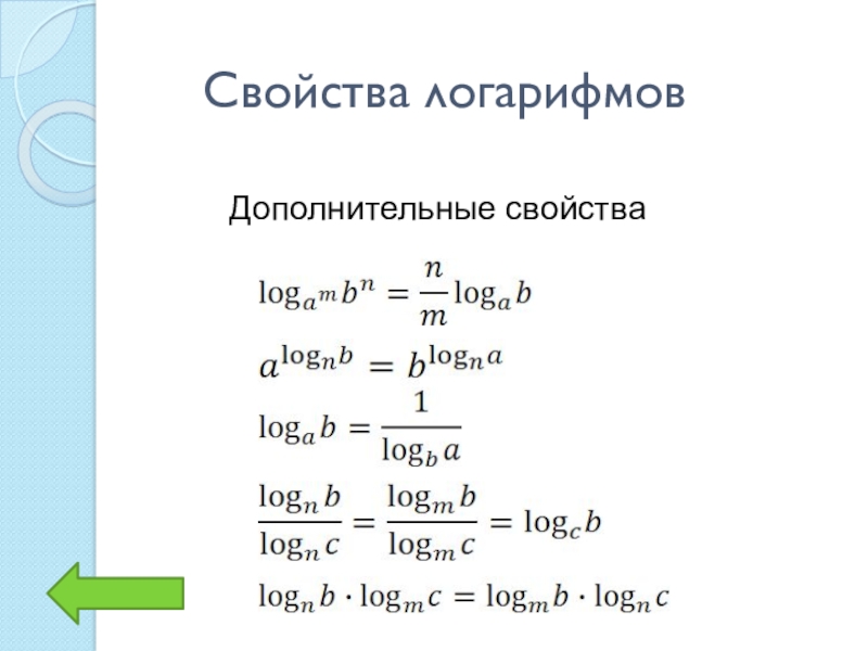 Свойства логарифмовДополнительные свойства