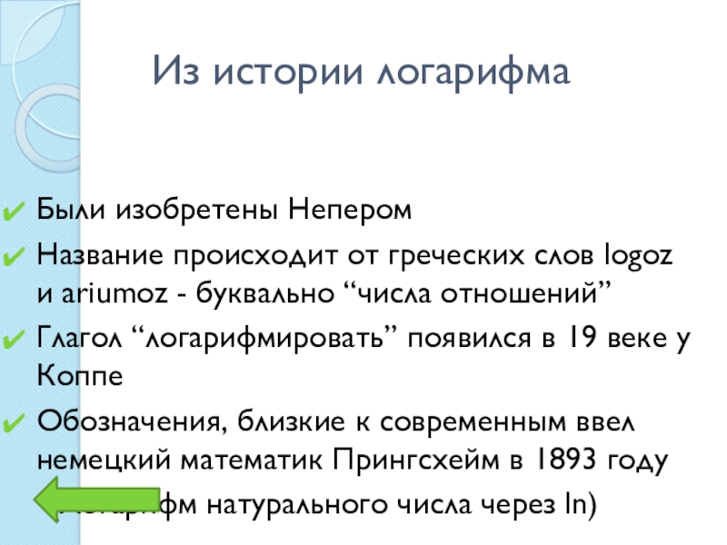 Из истории логарифмаБыли изобретены НеперомНазвание происходит от греческих слов logoz и ariumoz - буквально “числа отношений”Глагол “логарифмировать”