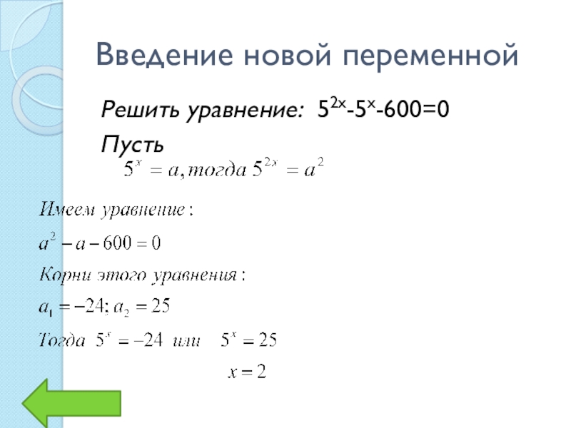Введение новой переменнойРешить уравнение: 52х-5х-600=0Пусть