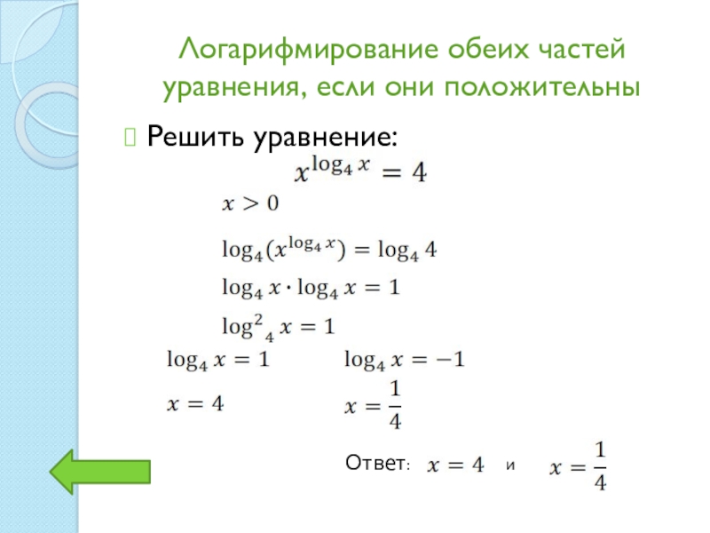 Слайд 27Логарифмирование обеих частей уравнения, если они положительны