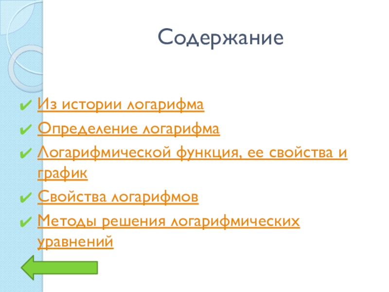 СодержаниеИз истории логарифмаОпределение логарифмаЛогарифмической функция, ее свойства и графикСвойства логарифмовМетоды решения логарифмических уравнений