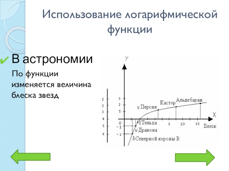 Использование логарифмической функцииВ астрономии  По функции изменяется величина блеска звезд
