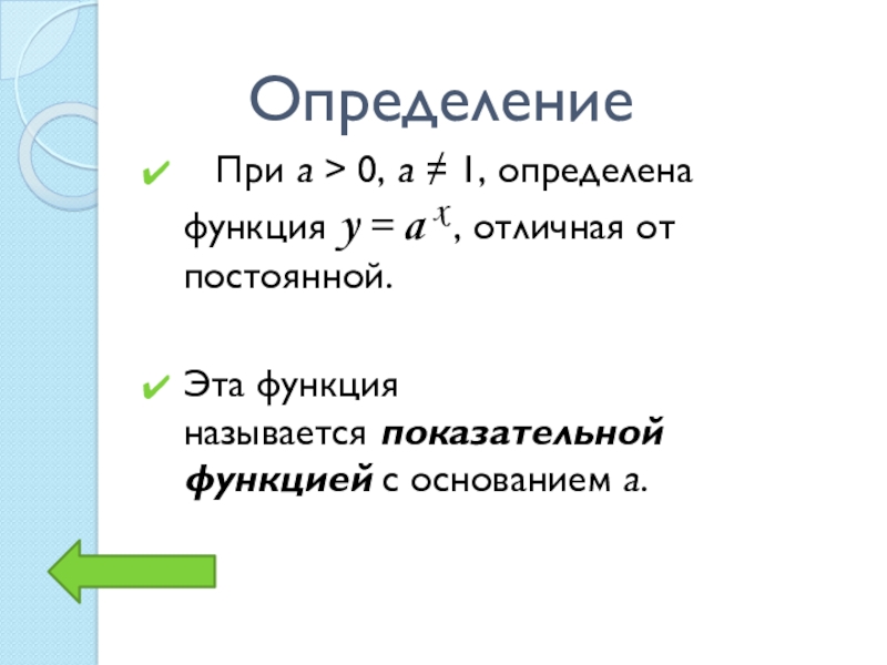 Определение  При a > 0, a ≠ 1, определена функция y = a x , отличная от постоянной. Эта функция называется показательной функцией с основанием a.