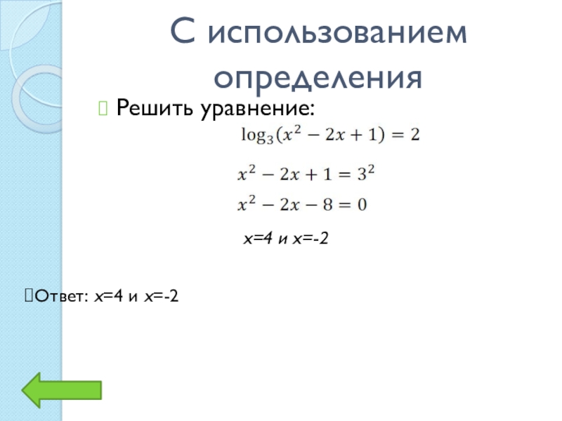 С использованием определенияРешить уравнение:x=4 и x=-2Ответ: x=4 и x=-2