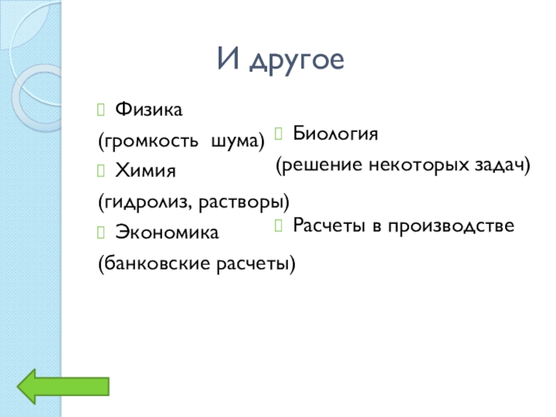 И другоеФизика(громкость шума)Химия(гидролиз, растворы)Экономика(банковские расчеты)Биология(решение некоторых задач)Расчеты в производстве