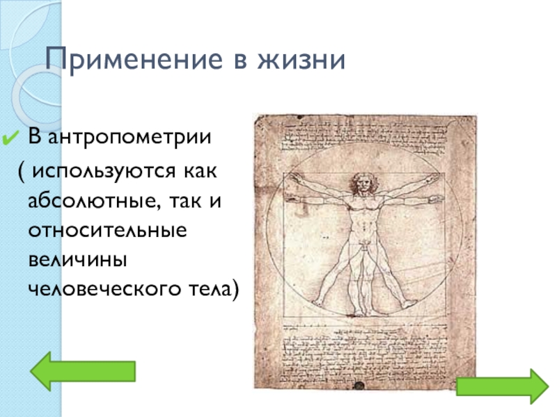 Применение в жизниВ антропометрии ( используются как абсолютные, так и относительные величины человеческого тела)